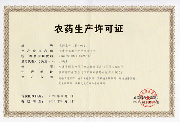 日前,甘肅西部鑫宇化學(xué)有限公司順利取得農(nóng)藥生產(chǎn)許可證,正式成為國(guó)家批準(zhǔn)的規(guī)范化農(nóng)藥生產(chǎn)企業(yè)。